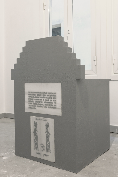 We exhibited a replica of Şehzade Seyfettin Fountain, believed to be built in the 19th century, and partially destroyed in the 1950s. The residents of the neighborhood salvaged parts of it, and kept it in a provisional form until a recent renovation. We were drawn to what this vernacular form holds. The video “Cabbage Fountain” is a mockumentary about the story of an odd-looking fountain in Çengelköy, İstanbul, supposedly built to show support for a javelin team called Cabbagers. “Days of Old” is a stop motion animation of a stone instantly growing a beard while it is lying on satin fabric.