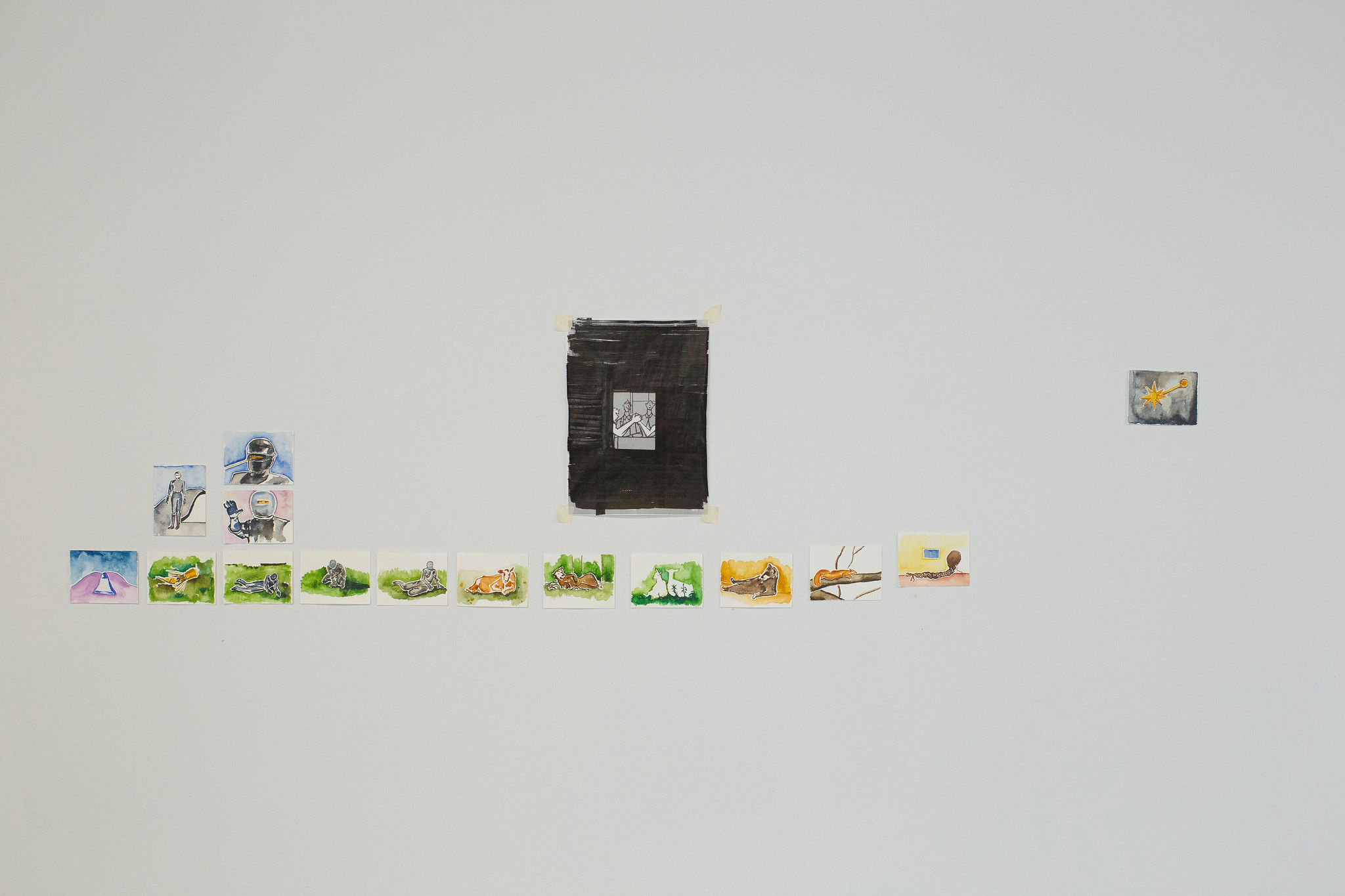 Using the Turkish word for cow – inek – as a case study, “How to Deal With Growing Up & Forgetting Things” explores the formation of an enemy, a nemesis, or a bully (depending on the context) through the embodiment of violence in language. The slang meaning of inek as a hard-working student emerged during the 1930s by university students organizing a politically critical spring festival. The term became popular through a fictional character, İnek Şaban (Şaban the cow), in a young adult fiction series Hababam Sınıfı (The Chaos Class). The author Rıfat Ilgaz intended it to be a satire of the Turkish educational system at the time; however, the intense bullying disguised as teenage male mischief was interpreted as comedy by the public when the books were adapted into film. The investigation focuses on the traces of “bullying disguised as teenage male mischief” in various contexts outside the academic institutions such as celestial counterparts with apparitions of Halley’s Comet, friendly and wise humanoid extraterrestrial Klaatu, hierarchy created between animal and human individuals by the construction of the category of farm animals as well as personal histories by owning an uncalled for nickname given to me by my own teenage male mischievous bully, “the mustache.” The installation consists of a pamphlet, several objects and images, drawings of animals and aliens, a sculpture made of feed bags, and a big mustache.